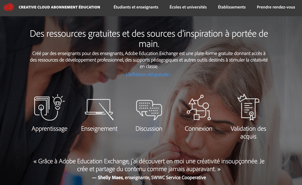 adobe Education Exchange est un service gratuit proposé par Adobe pour accompagner les utilisateurs de ses logiciels de création et notamment de la Creative Cloud qui regroupe plus d’une vingtaine d’applications dans une version éducation à tarif réduit.