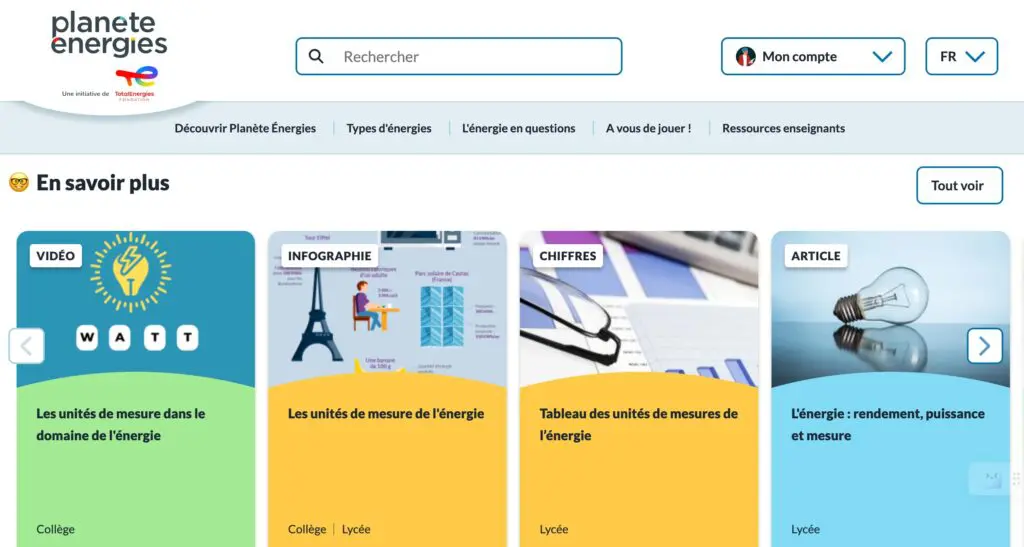 Planète Énergies, c’est un concentré de ressources pédagogiques . Plus de 500 vidéos, jeux, infographies, dossiers, en français et anglais, sont mis à disposition des élèves pour leur permettre de compléter et réviser leurs leçons ou de préparer leurs exposés et examens. Planète Énergies, c’est aussi un espace dédié aux enseignants. Entièrement gratuit, il leur propose des ressources pédagogiques pour enrichir et animer leurs cours ainsi que des conférences en classe dans toute la France.