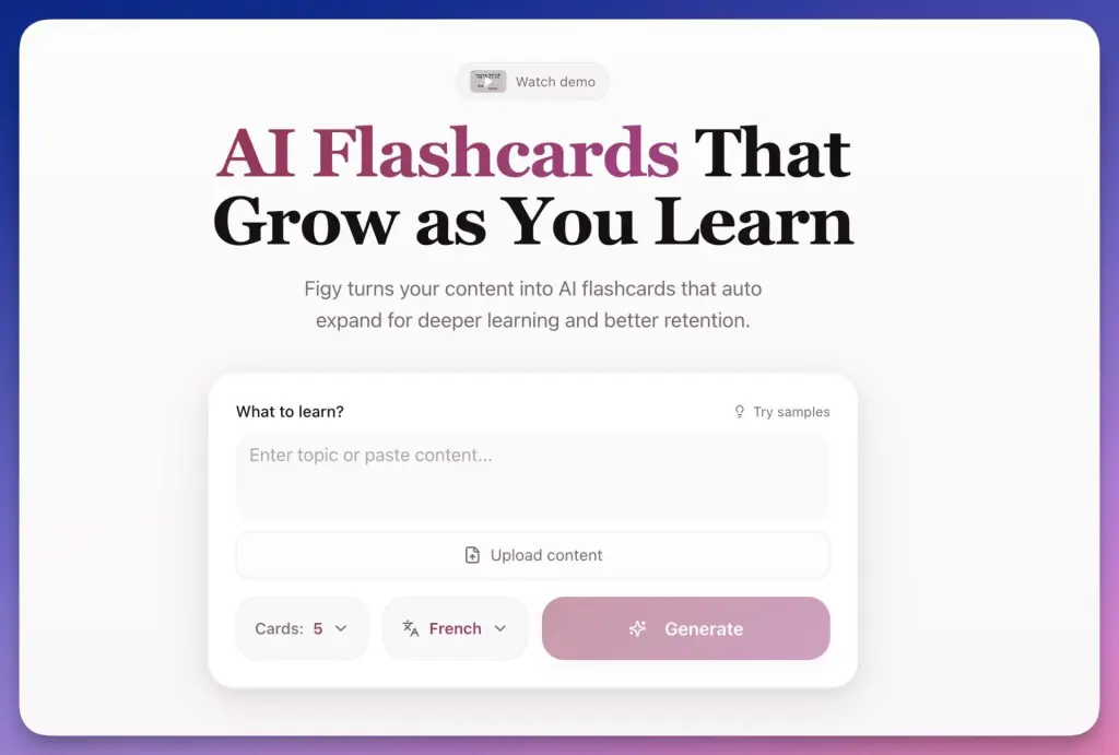 Figy fonctionne directement dans le navigateur. L’interface est sobre, sans surcharge visuelle. La logique est immédiatement compréhensible : on fournit un contenu → Figy propose des cartes mémoire → l’enseignant ajuste.