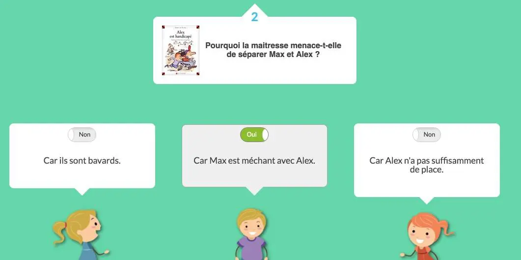 The young reader’s homepage shows a pretty virtual shelf with the covers of all the books that make up the Rally Reading. With one click, they will be able to access the proposed questionnaires. They will also discover in real time their ranking on the podium of the best readers. (If you prefer to keep the suspense and not show students their results as the rally progresses, this is also possible).